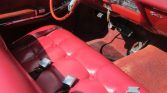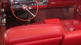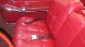 The interior features button-tucked red upholstery with a matching dashboard, door panels, and carpets. Amenities include electric windows, a power-adjustable front bench seat, front and rear lap belts, an analog clock, and a push-button radio. A matching soft top boot cover aLompanies the car and shows a repaired tear. Wear is noted on the carpet, and the seller states the analog clock is currently non functioning and that the passenger-side sun visor frame needs replacement.