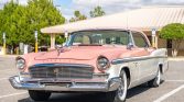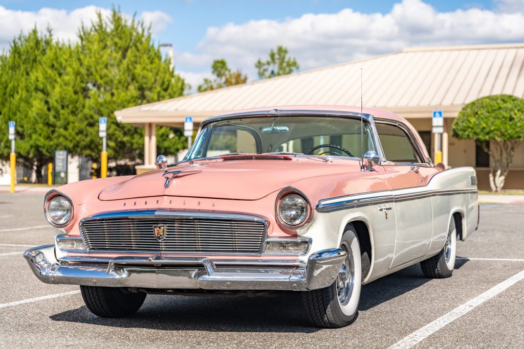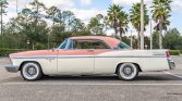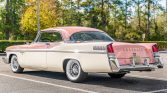 This 1956 Chrysler New Yorker Newport is a two-door hardtop finished in two-tone white and pink over a matching vinyl interior. Power is supplied by a 354ci Hemi V8 paired with a three-speed automatic transmission that features a push-button gear selector. Features include chrome bumpers and trim, dual exhaust, chrome wire wheels, air conditioning, power windows, a push-button AM radio, and lap belts.