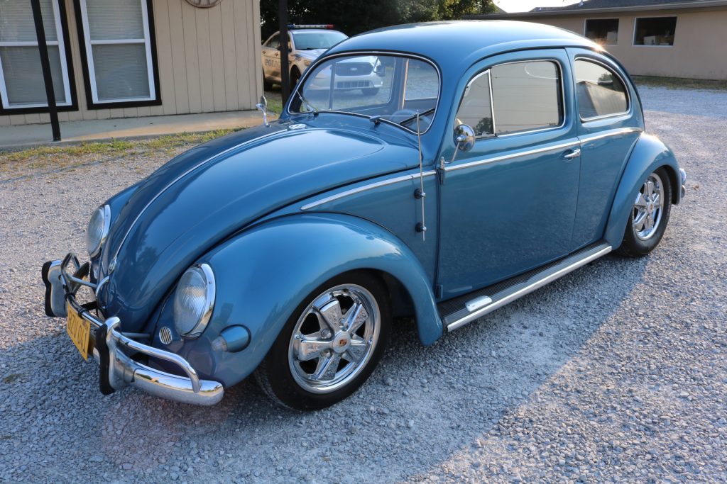 This 1956 Volkswagen Beetle is finished in Eismeer Blue Metallic over a two-tone gray interior and powered by a 2,387cc flat-four paired with a four-speed manual transmission. The car was acquired by the seller in 2007 and subsequently refurbished with work including a body-off repaint, refreshing the interior, and installation of a custom sound system with a Pioneer Bluetooth stereo, Porsche-style Fuchs wheels, a Porsche fan conversion, four-wheel disc brakes, a dual-outlet exhaust, and ISP instrumentation. Equipment consists of chrome-finished bumpers and trim, running boards, and halogen headlamps.