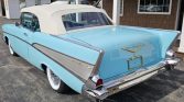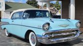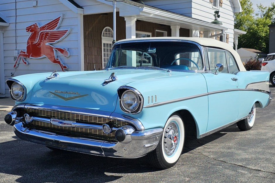 This 1957 Chevrolet Bel Air two-door convertible is finished in blue over a coordinated two-tone interior and is powered by a 283ci V8 paired with a two-speed Powerglide automatic transmission. The car was refurbished at some point under prior ownership and is equipped with a power-operated white soft top, a blue top boot, 14″ steel wheels, power steering, a split-folding front bench seat, and a push-button radio.