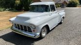 This 1957 GMC 100 pickup is finished in white over white and powered by a 350ci V8 mated to a three-speed automatic transmission. Features include oak bed slats, power-assisted front disc brakes, power steering, 15″ Prime alloy wheels, pinstriping, a chrome grille, trim, and bumpers, custom bucket seats, Classic Instruments gauges, a Blaupunkt AM/FM cassette stereo, an Edelbrock Performer intake manifold, HEI electronic ignition, a custom dual exhaust system, and a finned aluminum air cleaner and valve…