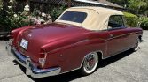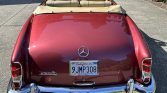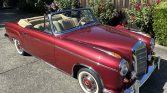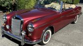 This 1959 Mercedes-Benz 220S convertible was restored between 2011 and 2018. It is finished in Almandine Red Metallic over cream leather and powered by a 2.2-liter inline-six mated to a column-shifted four-speed manual transmission. Equipment includes a tan soft top, 13″ steel wheels with with whitewall tires, wrap-around chrome bumpers, fender-mounted turn signals, individual front seats, a dash-mounted clock, and a heater.