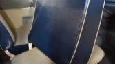 The cabin features seats upholstered in white and blue vinyl along with a blue dashboard and white and gray door panels.