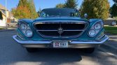 This 1961 Chrysler Newport wagon is finished in teal blue and white over parchment leather and powered by a replacement 440ci V8 paired with a Torqueflite three-speed automatic transmission. Features include angled quad headlamps, finned quarter panels, power front disc brakes, power steering, a push-button transmission gear selector, remote mirror control, 3-row seating with a stowable rear-facing bench seat, and chrome 15″ wire wheels.