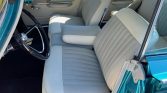The cabin features three rows of bench seating reupholstered in parchment leather with pleated inserts along with matching door trim panels. The car features a black dash covering and carpet, push-button transmission gear selector, remote mirror control, a rear-facing bench seat that stows in the floor, and an analog clock.