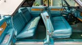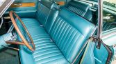 The interior was reupholstered in turquoise vinyl and features matching door panels accented with wood trim. Amenities include a six-way power-adjustable front bench seat, an AM radio, an automatic headlight dimming system, and Mercury floor mats.