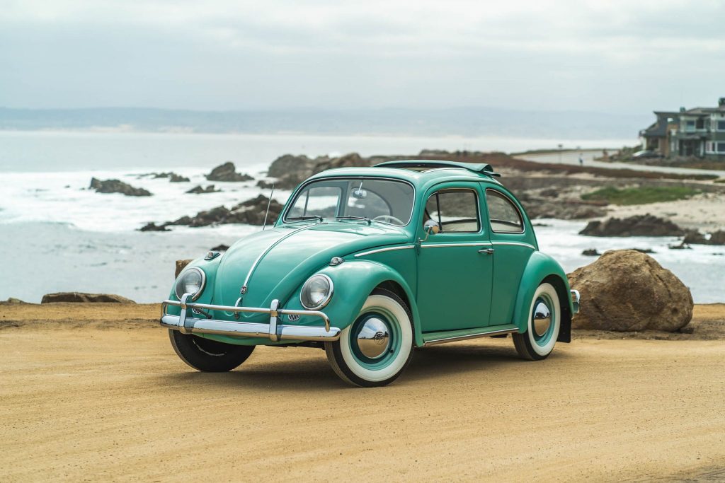 This 1962 Volkswagen Beetle was acquired by the current owner in 1997 and was subsequently refurbished, with work including a repaint in turquoise, a 12-volt electrical conversion, installing Firestone whitewall tires, and replacing the sunroof cover, spark plugs, ignition wires, distributor, wiring harness, carburetor, and fuel and brake-system components. Power is from a 1.2-liter flat-four paired with a four-speed manual transaxle, and equipment includes chrome bumpers, running boards, rear mud flaps, beige vinyl upholstery, and a spare wheel-mounted tool kit.