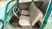 The cabin features front bucket seats and a rear bench trimmed in beige vinyl along with two-tone door panels, gray carpets, and a body-color dashboard. Equipment includes rubber floor mats, a glovebox, vent windows, and a driver-door storage pouch. The seat frames were reportedly powder-coated during the refurbishment.