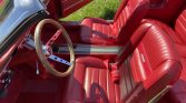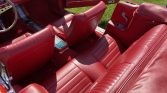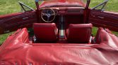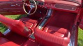 The interior was refreshed with Deluxe-style red upholstery with matching carpeting and trim. Equipment includes a woodgrain-trimmed center console, red lap belts, and a Custom Autosound retro-style stereo with an auxiliary input.