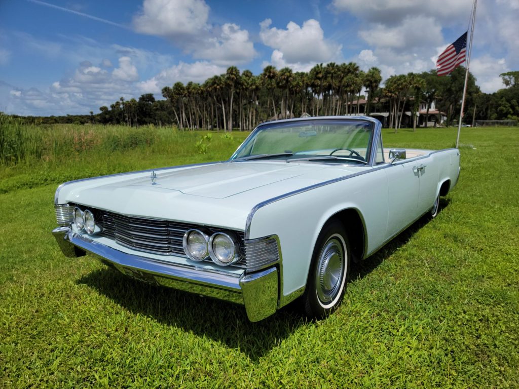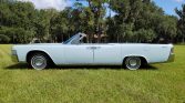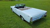 This 1965 Lincoln Continental convertible is finished in Platinum over white leather and is powered by a 430ci V8 paired with a three-speed automatic transmission. The car was acquired by the seller in 2008 and subsequently refurbished with work consisting of a repaint, servicing the convertible top, reupholstering the interior, rechroming the trim, and rebuilding the suspension, brakes, engine, and transmission. Equipment includes a power-operated white convertible top, air conditioning, a power antenna, an Edelbrock four-barrel carburetor, PerTronix electronic ignition, a rebuilt AM/FM radio, power windows and locks, power-adjustable front seats, and rear-hinged coach doors.