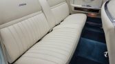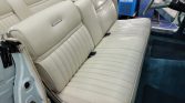 The cabin features bench seating reupholstered in white leather with matching door panels. Equipment includes air conditioning, power steering, a tilt steering column, a rebuilt AM/FM radio, an analog clock, lap belts, power-adjustable front seats, and power windows. The clock, audio system, air conditioning, vacuum systems, switches, and window systems were repaired at Lincoln Land of Clearwater, Florida.
