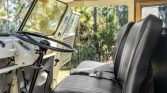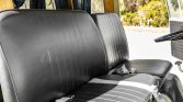 The cabin houses front bucket seats trimmed in black vinyl with matching door panels and rubber-lined floors. Lap belts are fitted for the front occupants.