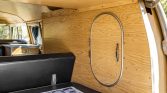 The bus was repainted its current shade of beige following completion of bodywork during prior ownership. Exterior features include white-finished bumpers with overriders, a Jalousie rear passenger-side window, a split windscreen, LED headlights, and chrome side-view mirrors. Spare rubber headlight and taillight seals are said to be included in the sale.