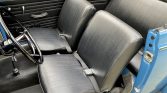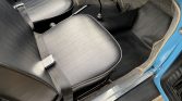 The seats are upholstered in black vinyl and are joined by matching door panels and replacement carpets protected by rubber floor mats. Features include a locking glovebox and a retro-style push-button stereo.