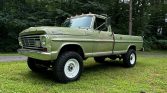 This 1967 Ford F-250 Ranger left the factory as a two-wheel drive Camper Special model equipped with a 352ci V8. Build carried out by Fairyland Automotive of Lehighton, Pennsylvania, involved disassembling the truck, refinishing the frame, rebuilding the three-speed automatic transmission, and installing a 360ci FE V8, a NP205 dual-range transfer case, and axles, brakes, and suspension components sourced from various late-model F-250s. The truck is finished in green and equipped with a Holley carburetor, Magnaflow mufflers, western-style side mirrors, clearance lights, Rough Country shocks, manually locking front hubs, and 17″ white-finished steel wheels as well as a cabin heater, an aftermarket stereo, and a bench seat upholstered in black vinyl.
