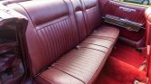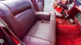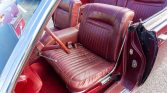 The cabin features dark red leather-upholstered seats with bright red carpet along with bright trim. Features include a power adjustable driver seat, power windows and mirrors, an analog dash clock, and an AM radio.