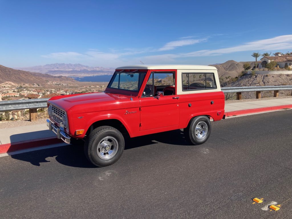 This 1968 Ford Bronco is refinished in Rangoon Red over red vinyl and black cloth and is powered by a replacement 5.0-liter V8 that was installed under prior ownership. Power is sent to the rear or all four wheels through a three-speed manual transmission, a Dana 20 dual-range transfer case, a Dana 30 front axle, and a limited-slip rear differential. Additional equipment includes aluminum cylinder heads, front disc brakes, 15″ slotted alloy wheels, a removable white hardtop, and dual fuel tanks.