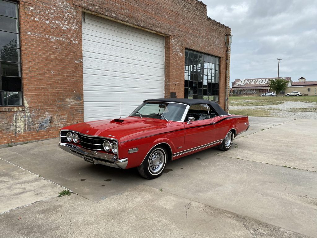 This 1968 Mercury Montego MX convertible is finished in red with black stripes over black vinyl upholstery, and power is provided by a 302ci V8 paired with a three-speed automatic transmission. Equipment includes a black soft top, an eight-track player, bucket seats, and a center console with a floor-mounted shifter. The power steering return line was replaced and the automatic transmission fluid was changed in January 2021.