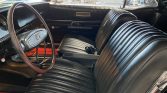 The seating surfaces are upholstered in black vinyl with faux wood trim accenting the matching dashboard and door panels. Amenities include an eight-track player, front bucket seats, and a center console with a floor-mounted shifter.