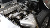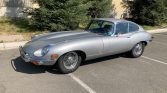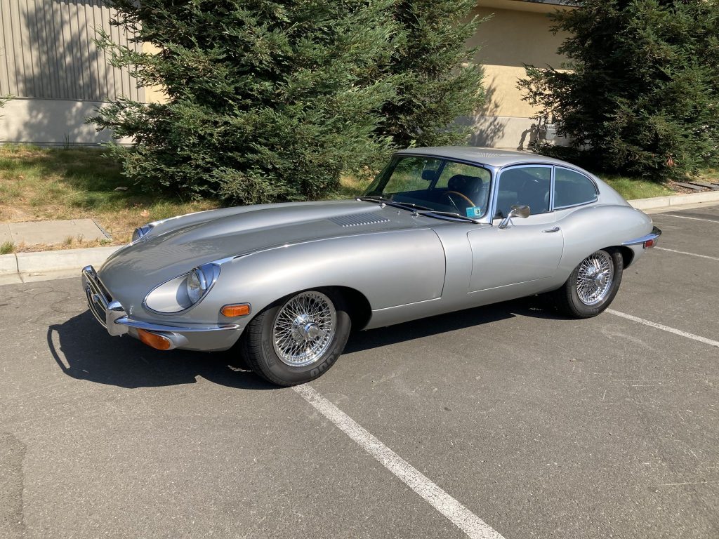 This 1969 Jaguar XKE is a silver-over-black Series II coupe powered by a 4.2-liter inline-six mated to a four-speed manual transmission. Equipment includes twin Zenith-Stromberg carburetors, chrome bumpers, a side-opening rear hatch, air conditioning, and a Bluetooth-capable stereo. The car was acquired by the seller in 2017, and services performed since included a recharge of the air-conditioning refrigerant and replacement of the front frame components, ball joints, front brake pads, and alternator.