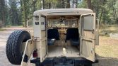 The seller states that the truck was previously light blue, and it now wears a weathered beige finish. Exterior features include black wheel arch flares, ambulance-style swing-out rear doors, and a receiver hitch.