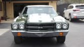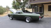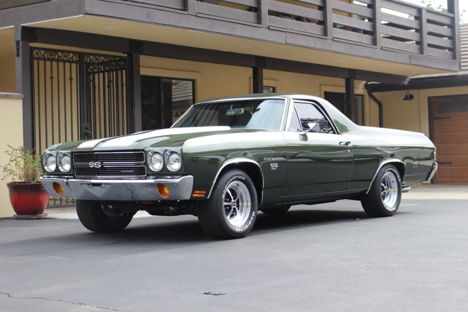 Work on this 1970 Chevrolet El Camino including a repaint in green with white stripes and the installation of a replacement 402ci V8 paired with a four-speed manual transmission. The suspension and brakes were overhauled, the interior was re-trimmed in black, and bucket seats from a late-model Camaro SS were installed according to the seller. Equipment includes a cowl hood, 15″ American Racing VN501 wheels, front disc brakes, a Weiand intake manifold, and a Holley four-barrel carburetor.
