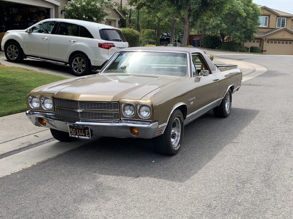 This 1970 Chevrolet El Camino was sold new by Courtesy Chevrolet of San Jose, California, and was acquired by the seller’s father-in-law in 1972. The car was stored from the early 1980s until 2006, when it is said to have been refurbished with overhauls of its numbers-matching 350ci V8, three-speed automatic transmission, carburetor, and brakes. Suspension components were also replaced, the fuel system cleaned, the vinyl roof replaced, and a color-coordinated fiberglass bed cover installed. Approximately 3k miles have been added since, and work in July 2021 included servicing the R134a air conditioning system as well as replacement of the battery.
