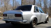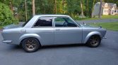 This 1970 Datsun 510 was acquired in 2018 by the seller and has since been modified with a 2.0-liter SR20DET fitted with a Garrett turbocharger, a CX Racing intercooler, and HKS camshafts. Power is sent to the rear wheels through a five-speed manual transmission with a Nismo twin-disc clutch and a limited-slip differential, and additional modifications include a repaint in Titanium Metallic and matching fender flares, along with 15″ Volk Racing wheels, Wilwood disc brakes, Techno Toy Tuning coilovers, Hyperco springs, Speedhut instrumentation, Recaro seats, and a Retrosound Bluetooth stereo.