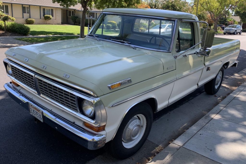 This 1970 Ford F-250 was purchased new by the seller’s father-in-law and acquired by the seller in 1988. The truck is finished in two-tone Yucatan Gold and Wimbledon White and powered by a 360ci V8 paired with a three-speed automatic transmission. Equipment includes the Sport Custom trim package, power steering and brakes, an auxiliary fuel tank, a steel diamond-plate rear bumper, extended side mirrors, a bench seat, and a sliding rear window.