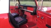 The cabin features front bucket seats and a rear bench trimmed in black upholstery with burgundy inserts. The floors have been sprayed with red bedliner material, and additional equipment includes a heater and front and rear lap belts.