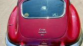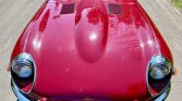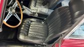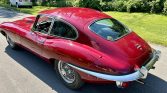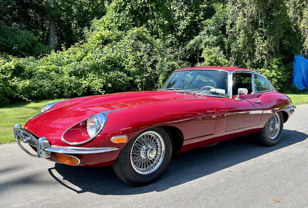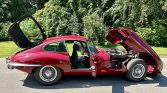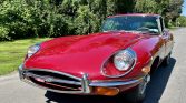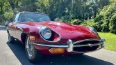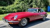 This 1970 Jaguar XKE Series II coupe is finished in Regency Red over black leather and powered by a 4.2-liter inline-six linked with a four-speed manual transmission and a limited-slip differential. Equipment includes a louvered clamshell hood, four-wheel disc brakes, 15″ wire wheels, a wood-rimmed steering wheel, an AM/FM radio, and a heater.