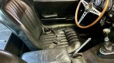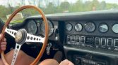 The wood-rimmed steering wheel frames Smiths instrumentation including a 160-mph speedometer and a tachometer with a 5k-rpm redline as well as an analog clock and gauges for voltage, oil pressure, coolant temperature, and fuel level. The five-digit odometer shows 69k miles.