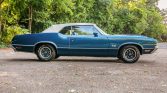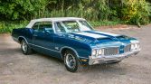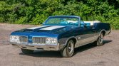 This 1970 Oldsmobile 442 convertible was initially delivered to Krouse Oldsmobile of Cherry Hill, New Jersey, and it is powered by a 455ci Rocket V8 that was overhauled in 2021. Power is routed through a three-speed automatic transmission and a heavy-duty performance rear axle with 3.23:1 gearing. Finished in blue with a power-operated white soft top and matching stripes, the car is equipped with ram-air induction, 14″ Super Stock III wheels, power steering, front disc brakes, and a…