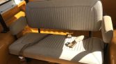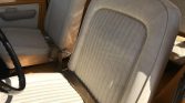 The seats have been fitted with replacement foam and white vinyl covers, and the cabin features a matching dash and door panels. Interior equipment includes a roll bar, a radio, a heater, a lockable glovebox, lap belts, and rubber floor coverings.