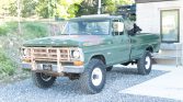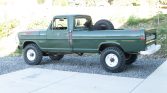 The power on this 1971 Ford F-250 Custom 4×4 pickup is provided by a 390ci V8 linked with a four-speed manual transmission and a dual-range transfer case and the truck is finished in green over green vinyl upholstery. Features include a rear step bumper, front tow hooks, a white brush guard, an Edelbrock 600-cfm carburetor, stainless-steel exhaust headers, electronic ignition, manually locking front hubs, white 16″ steel wheels, and Old Man Emu shocks. The cabin is outfitted with an AM radio, Bass 48 overhead speakers, and a heater.