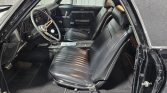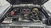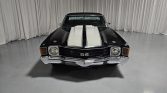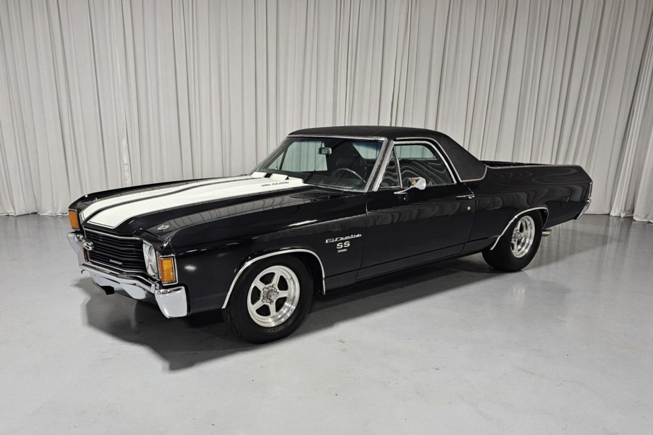 This 1972 Chevrolet El Camino is powered by a replacement 396ci V8 linked with a four-speed manual transmission, and it is finished in black with white rally stripes and a black vinyl roof cover. Equipment includes a cowl-induction hood, 15″ five-spoke wheels, Mickey Thompson tires, front disc brakes, and power steering, while the engine is fitted with an Edelbrock intake manifold, a Holley four-barrel carburetor, aluminum cylinder heads, long-tube headers, Flowmaster mufflers, and MSD ignition components. The cabin…