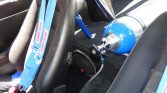 The cabin is upholstered in black and is equipped with Recaro bucket seats and Simpson racing harnesses. Features include a B&M shifter, a chrome roll bar, a wide-angle rearview mirror, and an aftermarket stereo system. A nitrous oxide bottle is mounted in the rear cargo area, and the controls for the system are housed in the glovebox.