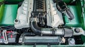 This 1973 Ford Bronco was refurbished and modified with the installation of a Roush-supercharged 5.0L Coyote V8 linked to a 10L80 ten-speed automatic transmission, a twin-stick transfer case, and locking front and rear differentials. The body was refinished in mint green pearl, and the truck rides on a lifted suspension in addition to 17″ steel wheels mounted with 35″ tires. Further equipment includes a removable hardtop, Mile Marker manually locking front hubs, power-assisted disc brakes, LED headlights, power-deployable side steps, and custom-fabricated front and rear bumpers. Inside, the front bucket seats are trimmed in saddle leather and are accompanied by Vintage Air Climate control, Dakota Digital instrumentation, a Flaming River steering column, and a custom audio system.