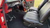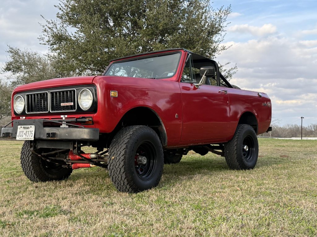 This 1973 International Harvester Scout II was refinished in red over black vinyl and is powered by a 304ci V8 linked to a four-speed manual transmission and a two-speed transfer case. Equipment includes a body lift, power steering, black 15″ steel wheels, a black bikini top, and a roll bar.