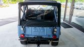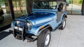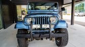 This 1973 Jeep CJ-5 is finished in metallic blue over black black upholstery, and it is powered by a 304ci V8 paired with a three-speed manual transmission and a dual-range transfer case. Equipment includes a black soft top and doors, along with a fold-down front window, a roll bar, nerf bars, receiver hitches, aftermarket suspension components, an Edelbrock intake manifold and carburetor, a Sony CD stereo paired with aftermarket speakers, a brush bar with auxiliary lights, and 15″ Pacer steel wheels with 32″ tires.