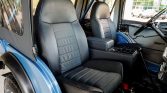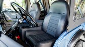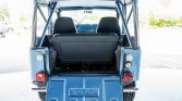 The cabin features front bucket seats and a rear bench upholstered in black, along with a body-colored metal dashboard and dark gray carpets. Amenities include a locking center console, a passenger grab bar, and a Sony CD stereo hooked to speakers mounted on the rear wheel wells.