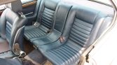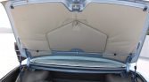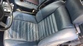The cabin features blue leather upholstery with darker blue and gray carpeting along with wood trim on the dashboard and door panels. Equipment includes a period radio, power windows, and front bucket seats with adjustable headrests.