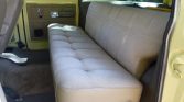 The high-back front seats and two rear benches are upholstered in Sage vinyl with cloth inserts, and the cabin features a center console and air conditioning. The horn, cruise control, clock, and stereo are non-functional. Tears on the driver’s seat have been repaired with tape and discoloration is noted on the headliner. Spare fabric is included along with replacement armrests and door panels.