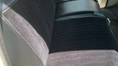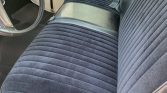 The cab features a bench seat that was reupholstered in gray vinyl with cloth inserts under previous ownership. The door panels are black, and the interior is finished in white with black accents on the dashboard. Equipment includes manual windows and door locks as well as an aftermarket JBL stereo.