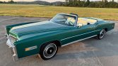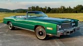 This 1976 Cadillac Eldorado Convertible is finished in Greenbrier Firemist over white Sierra Grain leather and is powered by a 500ci V8 paired with a three-speed automatic transmission. The car is equipped with a white soft top, four-wheel disc brakes, 15″ steel wheels, black wheel covers, a power-adjustable front bench, automatic climate control, automatic headlights, power windows, and an AM/FM stereo with an eight-track player.