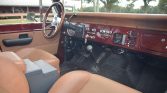 Aluminum 17″ wheels are fitted with 35×12.5″ BFGoodrich Mud-Terrain KM3 tires, and suspension modifications include a James Duff 3.5” lift kit with soft-ride dual shocks at all four corners and a Heim joint system. Stopping power is provided by power-assisted disc brakes featuring slotted and cross-drilled rotors and stainless-steel lines, and the seller reports the master cylinder and proportioning valve were replaced during the refurbishment. A close-ratio power steering box is also said to have been fitted.