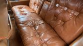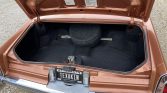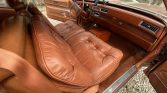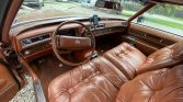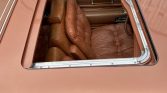 The cabin houses a power-adjustable split front bench seat and a rear bench that are upholstered in tufted Antique Medium Saffron leather (674) along with matching door panels and carpeting. Amenities include a vintage-look digital stereo, faux wood trim, automatic climate control, cruise control, a telescoping steering wheel, Cadillac-branded floor mats, and power windows and door locks.