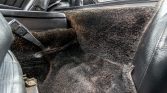 The cabin features seats upholstered in black vinyl along with a matching dashboard, center console, door panels, and carpets. Amenities include air conditioning, a Hitachi AM/FM stereo, a rear defroster, and an armrest. The headlight switch was replaced in December 2020. The clock does not work, a tear is visible on the driver’s seat, and the carpets show fading.