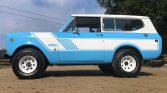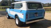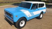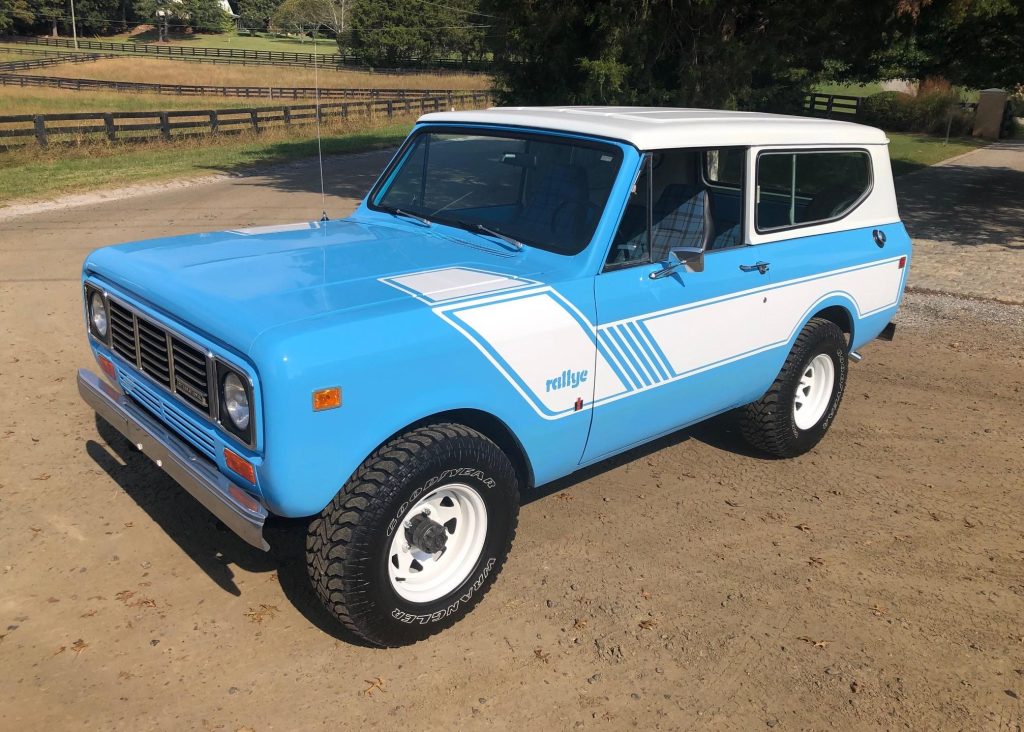 This 1979 International Harvester Scout II was delivered new to City Sales Company of Wilkesboro, North Carolina and underwent a cosmetic refurbishment between 2016 and 2018 that included a bare-metal repaint in Lexington Blue, replacement floors, and a reupholstered plaid fabric and black vinyl interior. The truck is powered by a 345ci V8 paired with a three-speed automatic transmission and dual-range transfer case and is equipped with a removable white hardtop, an under-dash air conditioning system, Kenwood AM/FM cassette stereo, and 15” white-painted steel wagon wheels. Work following the seller’s recent acquisition has included the installation of Dynamat sound deadening material, Rancho shock absorbers, H4 headlights, and white Rallye-style graphics, along with a rebuilt carburetor and replacement of the tires, spark plugs, bumpers, grille, starter, and fuel pump.