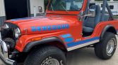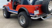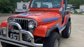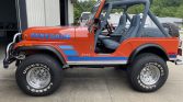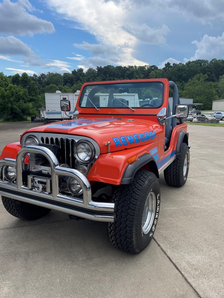 This 1979 Jeep CJ-5 is finished in orange with blue Renegade graphics over blue vinyl upholstery and is powered by a 304ci V8 paired with a three-speed manual transmission and a dual-range transfer case. Equipment includes a suspension lift, aftermarket chrome bumpers, a Warn winch, and a roll cage. The seller acquired the truck in 2019, and an oil change was completed in preparation for the sale.